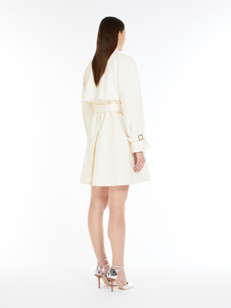 Short trench coat with a flared line, made of luxurious wool and silk with an organza feel. Semi-lined couture-inspired garment, featuring a lapel collar, raglan sleeves with cuff straps and side pockets with flap and button. Finished with tailor’s pick stitch, storm flap on the front, cape on the back and a central reverse pleat on the back with concealed buttons. The matching belt accentuates the silhouette. Double-breasted fastening with buttons.