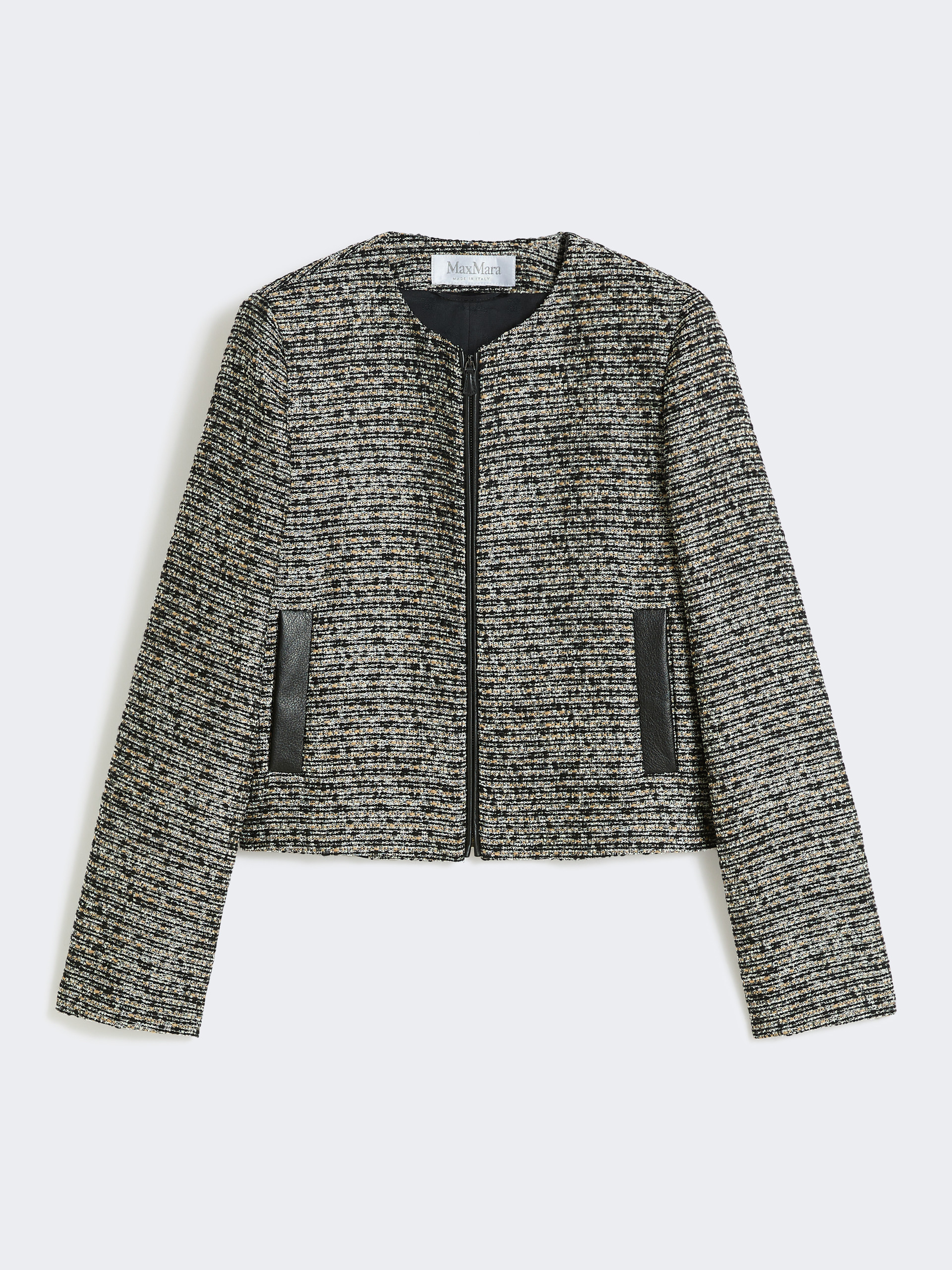 Feminine jacket with a cropped waist cut. - Wool basketweave jacket - Straight fit - Crew-neck - Set-in sleeves - Front zip fastening with a leather double pull-tab - Leather vertical-welt pockets - Lined model