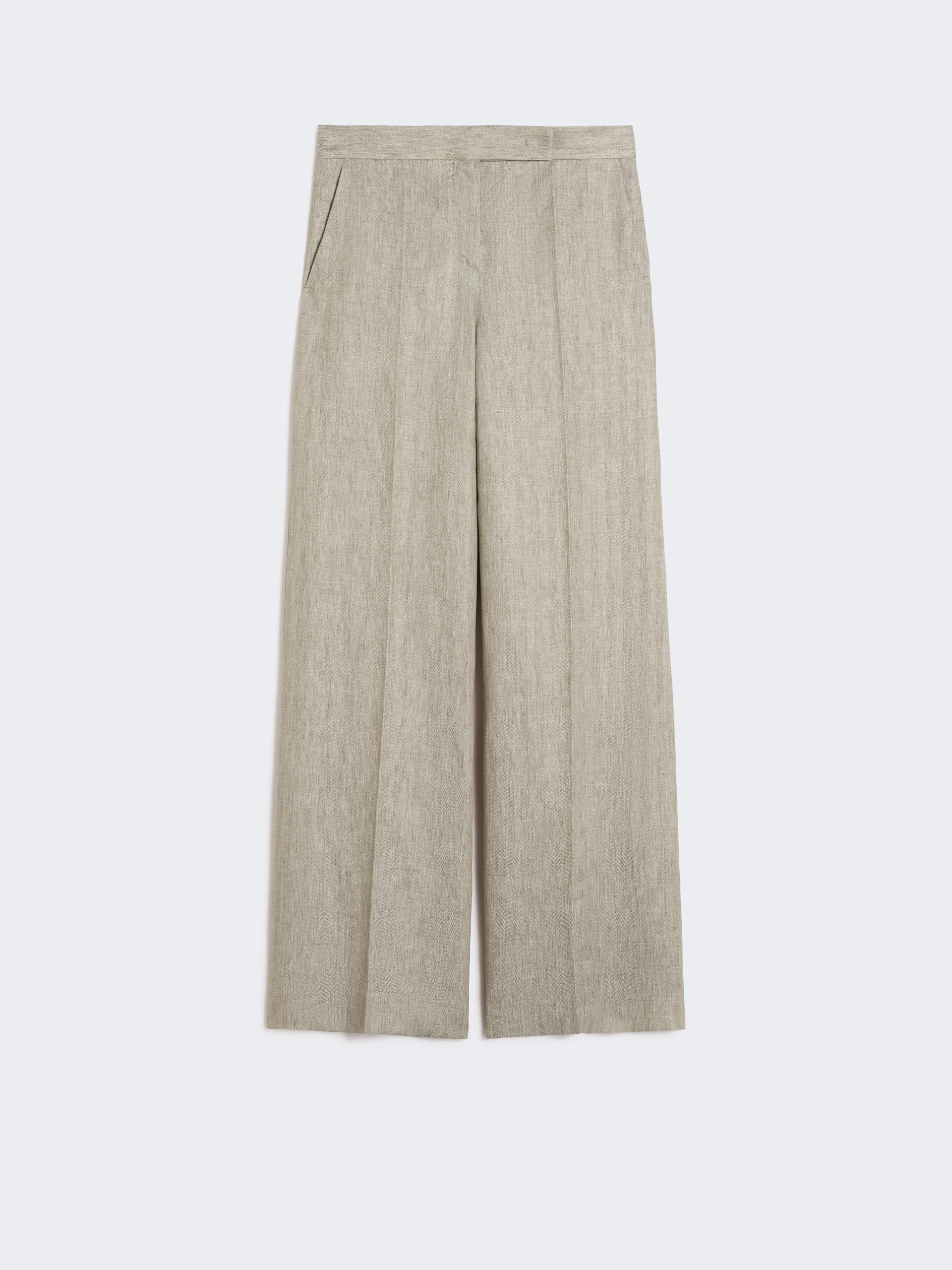 Mannish-inspired long trousers featuring a herringbone pattern. - Mottled pure linen twill trousers - Wide leg - High-cut waistband with a fly-covered zip and hook-and-bar fastening - Slant side pockets - Pressed pleat detail and sewn darts on the back of the waist