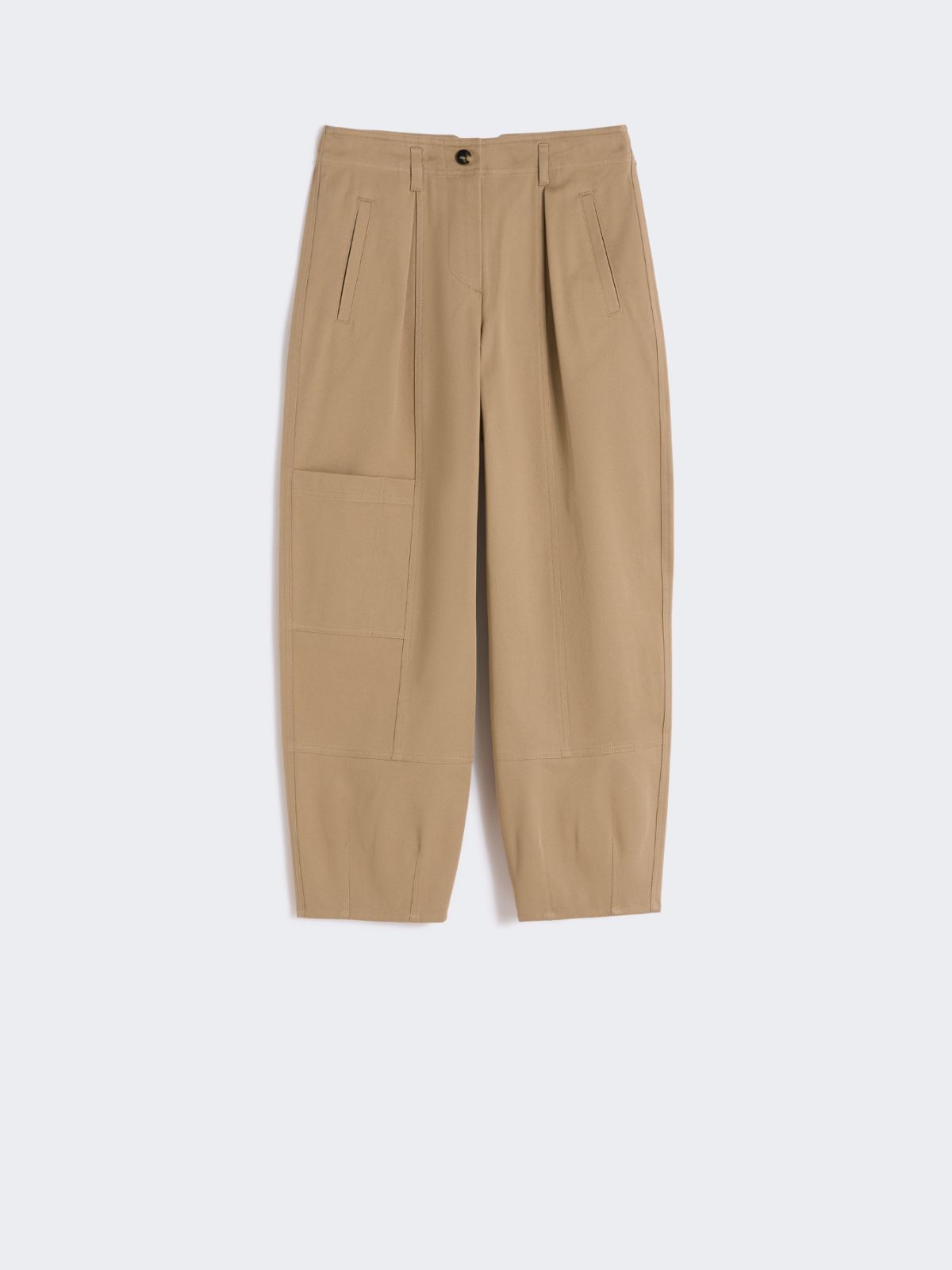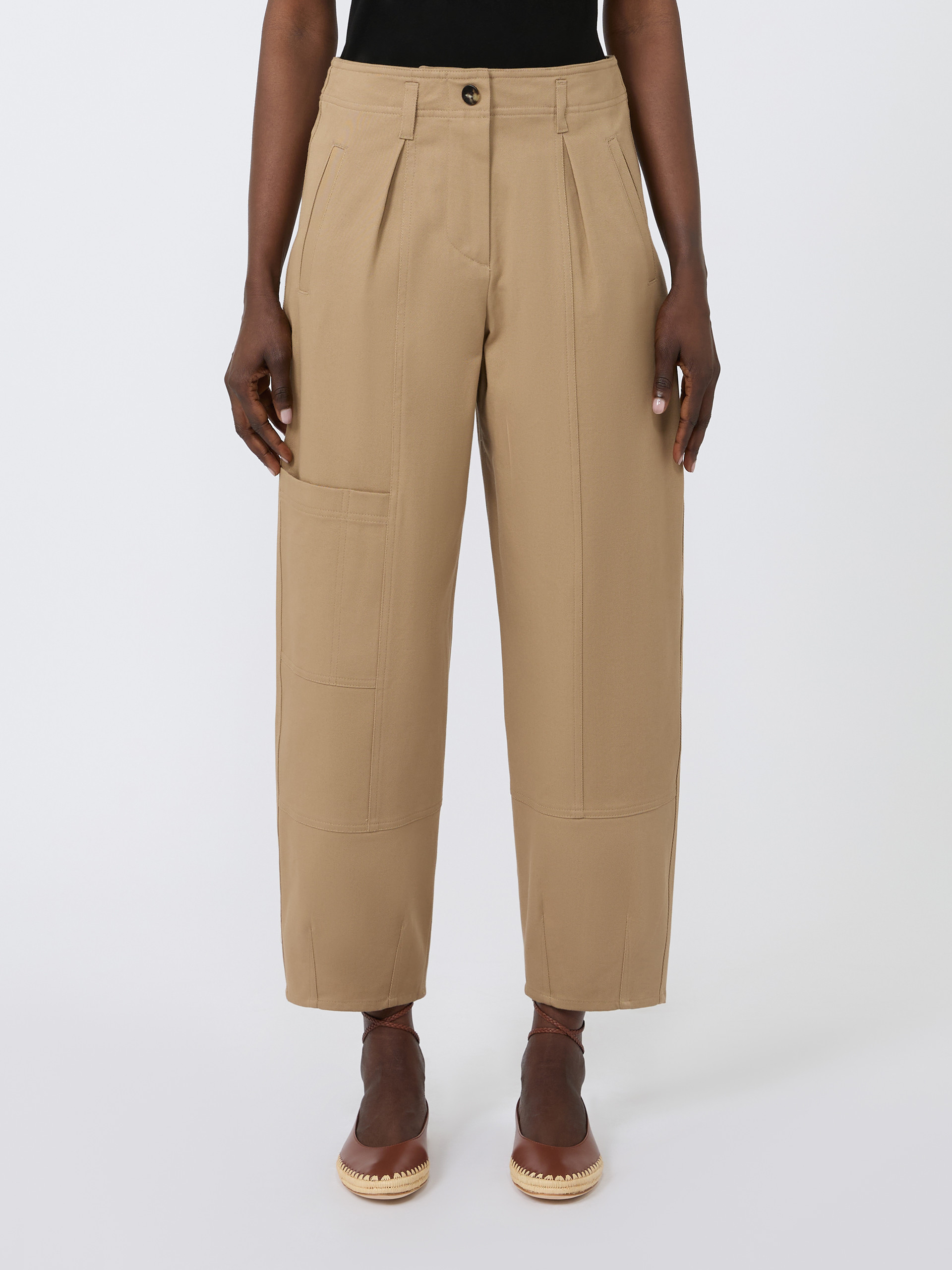 Cargo trousers featuring a utility-style patch pocket on the right leg. - Trousers in washed stretch cotton bull denim - Wide leg with hem-tapering dart detail - High-cut waistband with a fly-covered zip and button fastening - Welt side pockets - Patch rear pockets - Pressed pleat detail and belt loops at the waist - Branded leather label affixed to the rear right pocket
