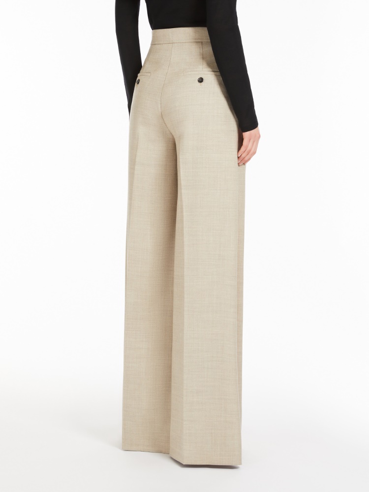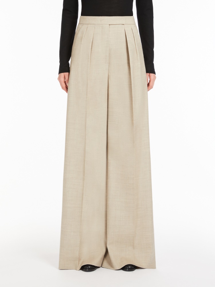 Palazzo trousers in lightweight, mélange pure wool gabardine, distinguished by a silhouette with wide leg, double pleats at the waist and trouser crease. Featuring inset side pockets and welt pockets with button at the back. Fastening with a wide waistband tab, zip fly and small hook.