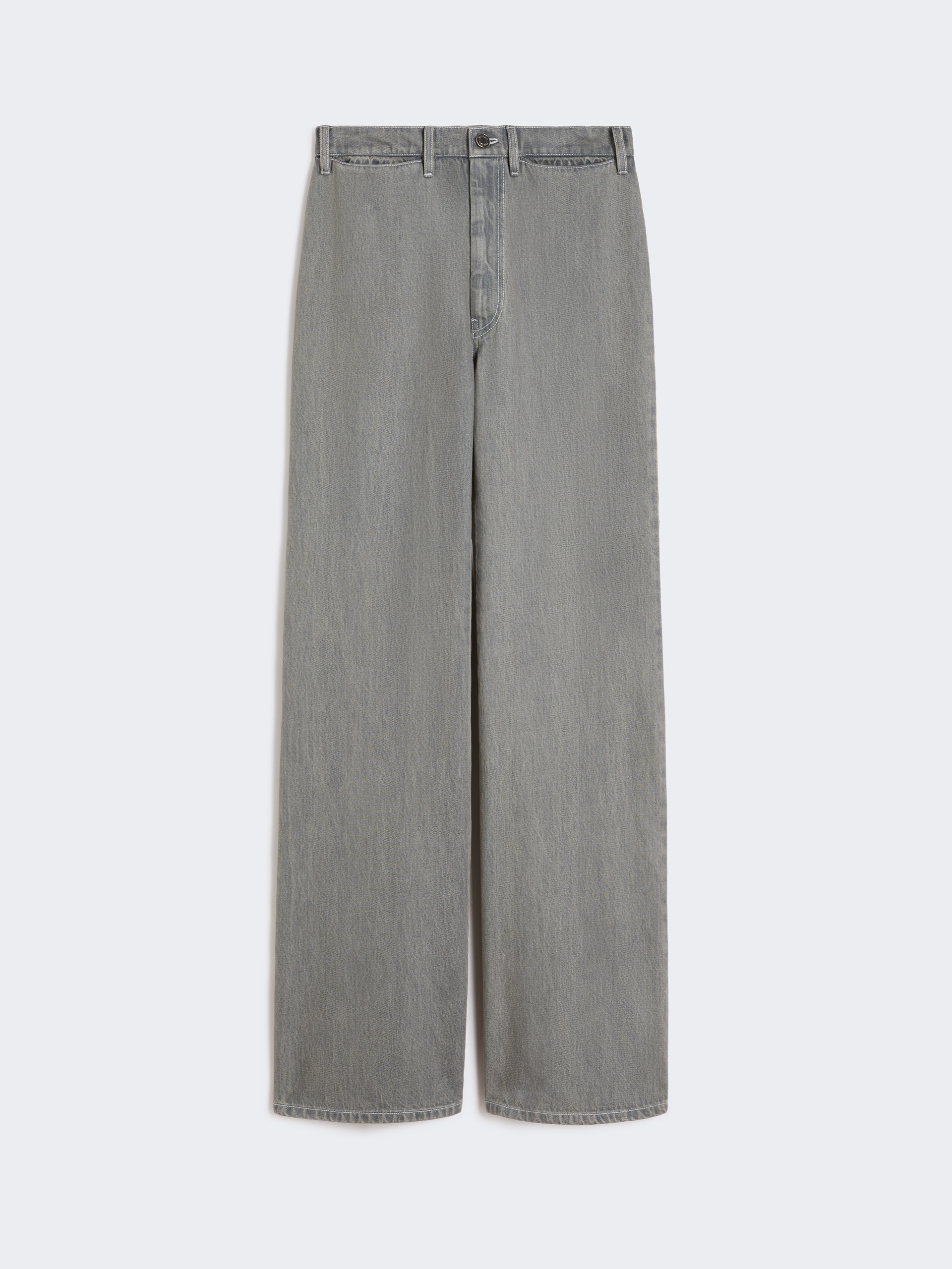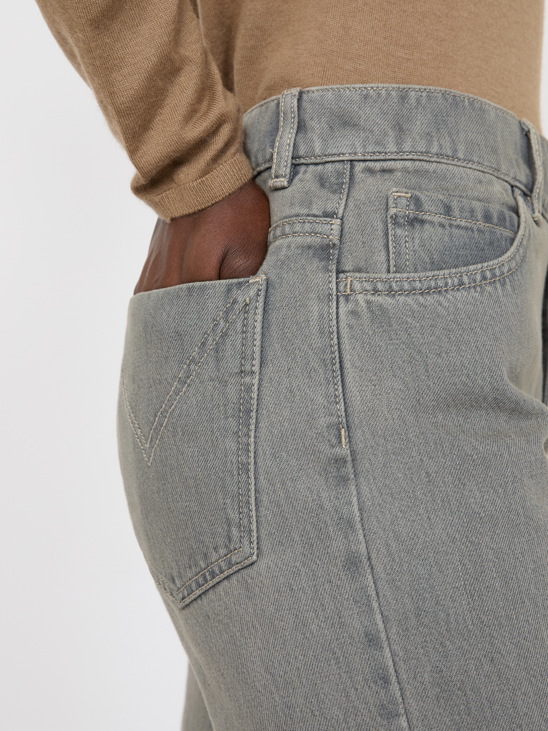 Jeans-style garment-washed trousers. - Pure cotton denim trousers - Straight leg - High-cut waistband with a fly-covered zip and button fastening - Horizontal welt pockets at the front - Patch rear pockets - Branded leather label on the back of the waist