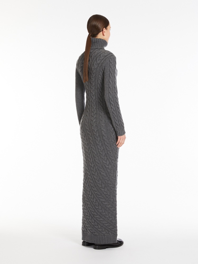 Long clinging dress made in a luxurious combination of cashmere and wool. High neck and long set-in sleeves. The particular fancy ribbing with a flessage knit gives movement and structure to the dress. Finished with ribbed edges.