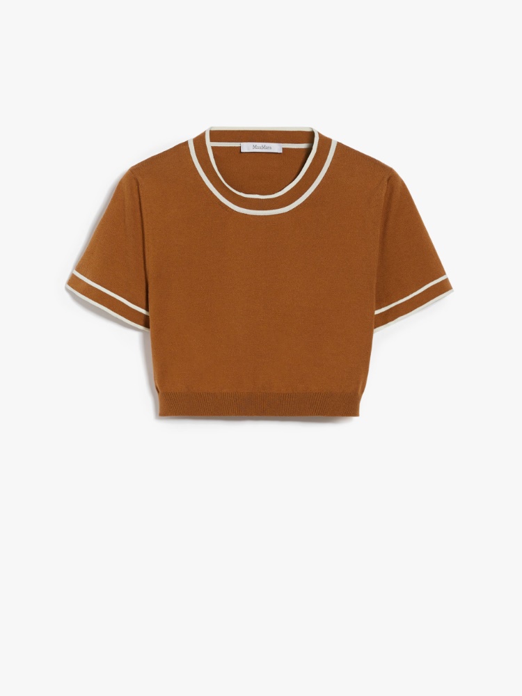 本款毛衣,短袖圆领设计,饰有对比色饰边
