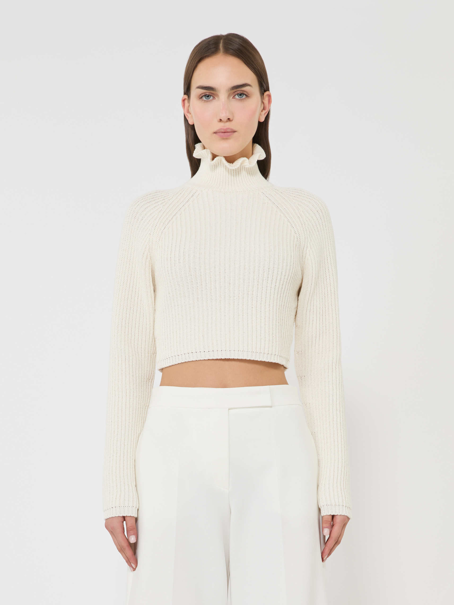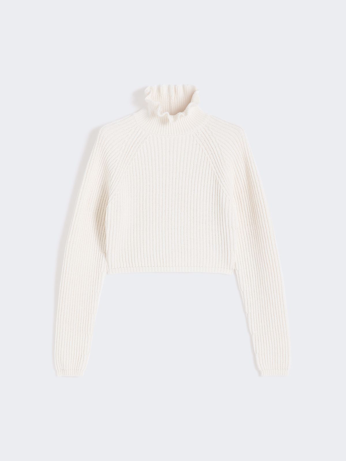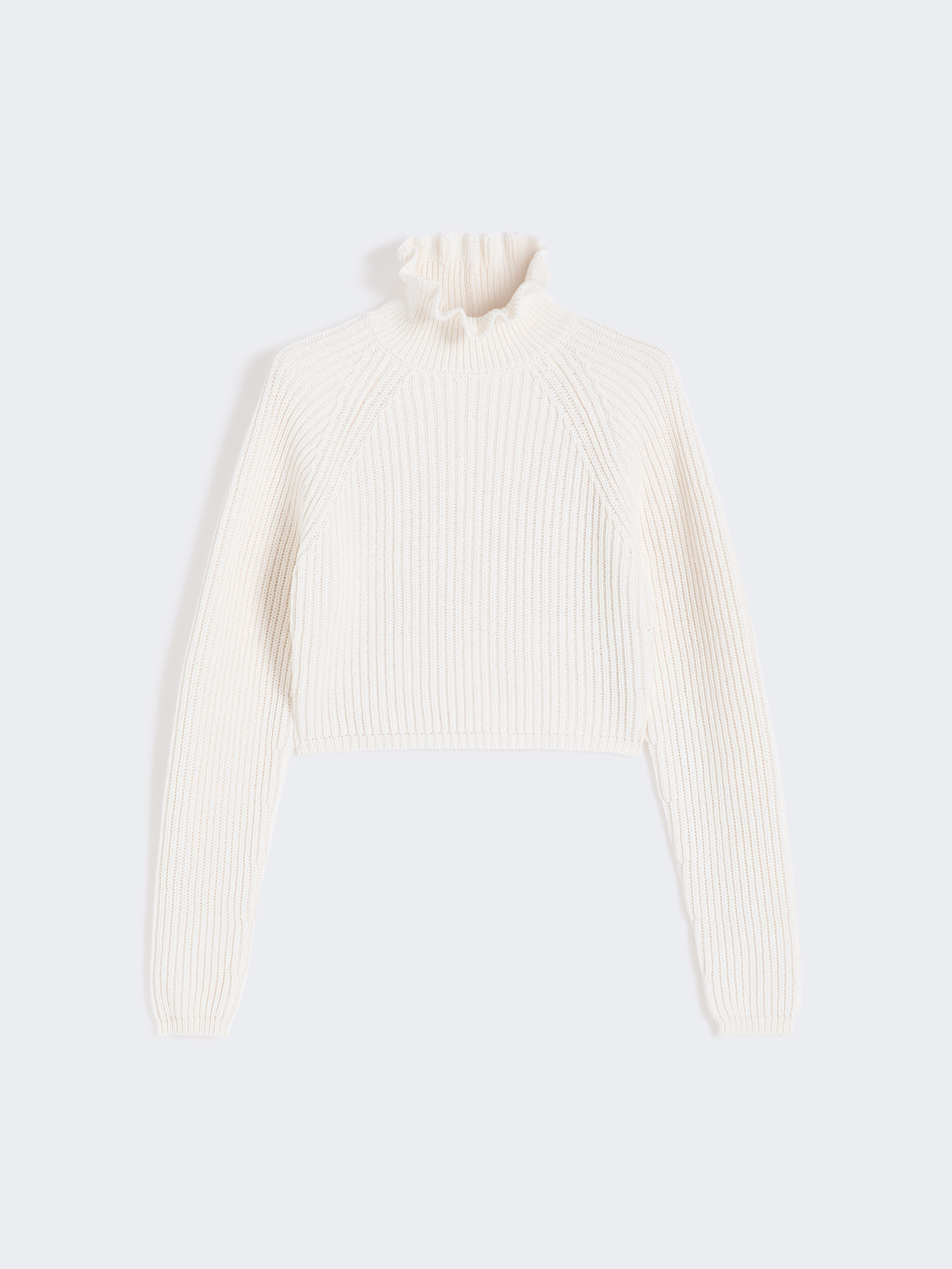 Cropped jumper, featuring a loose high neck that creates a flounce motif. - Slim fit - Pure cotton cordonnet yarn jumper - Fisherman’s rib knit - Long raglan sleeves at the front, and kimono-style at the back