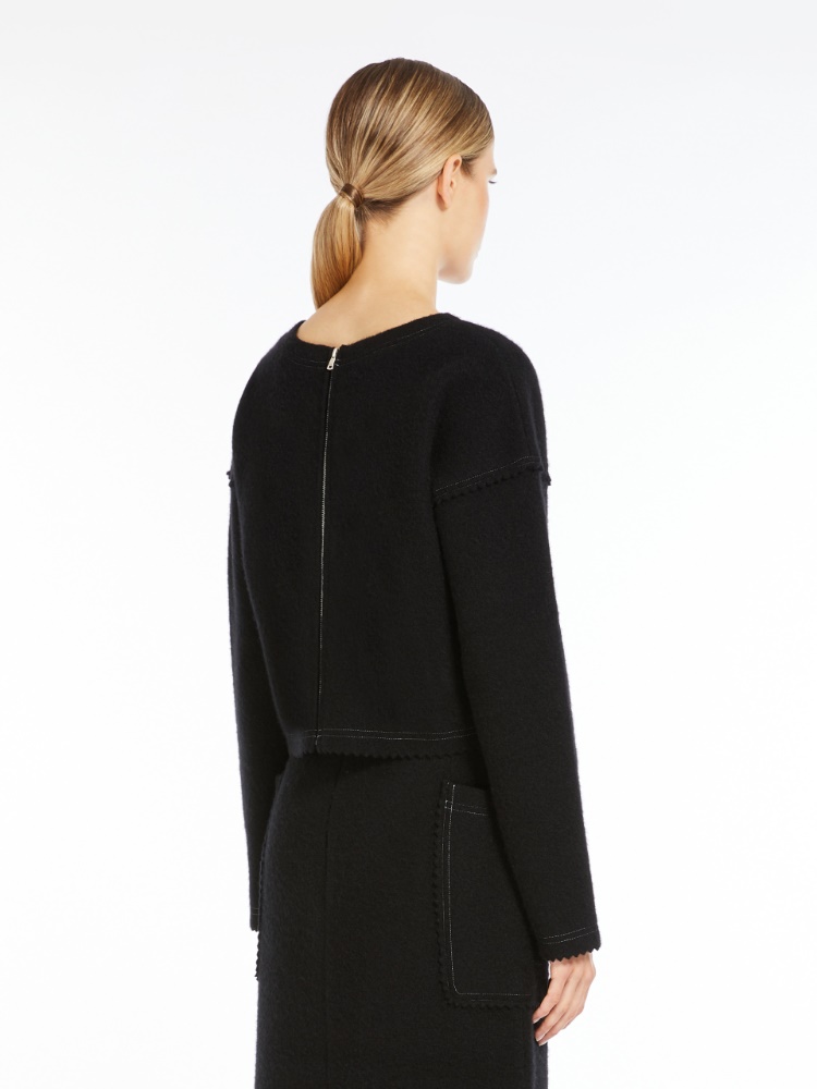 Cropped jumper made of wool and cashmere yarn in a felted-effect plain knit. Crew-neck style with long, low-set sleeves, finished with laser-cut zig-zag edges and contrasting stitching. Metal zip fastening at the back.