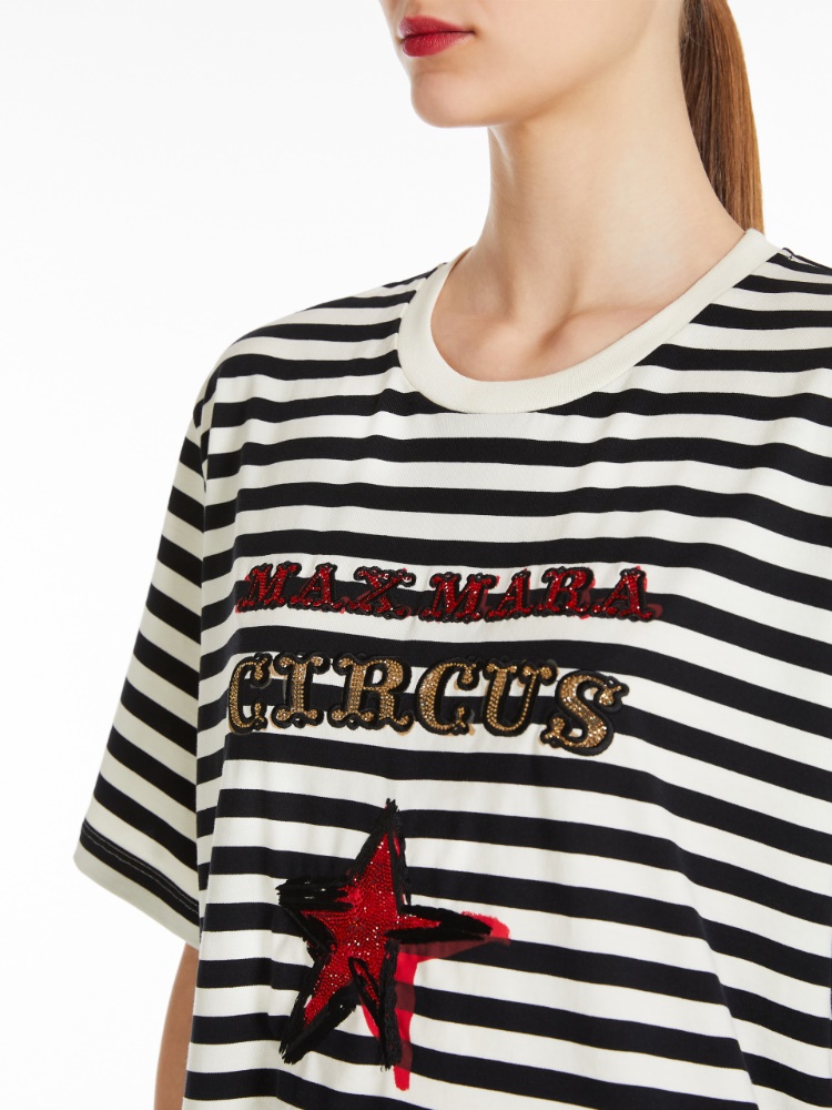 Oversized T-shirt made of soft, pure cotton striped jersey. The garment is customised with the Max Mara logo and Circus collection motif embroidered on the front in a mix of contrasting materials and colours. Features a round neckline and short sleeves with dropped shoulders.