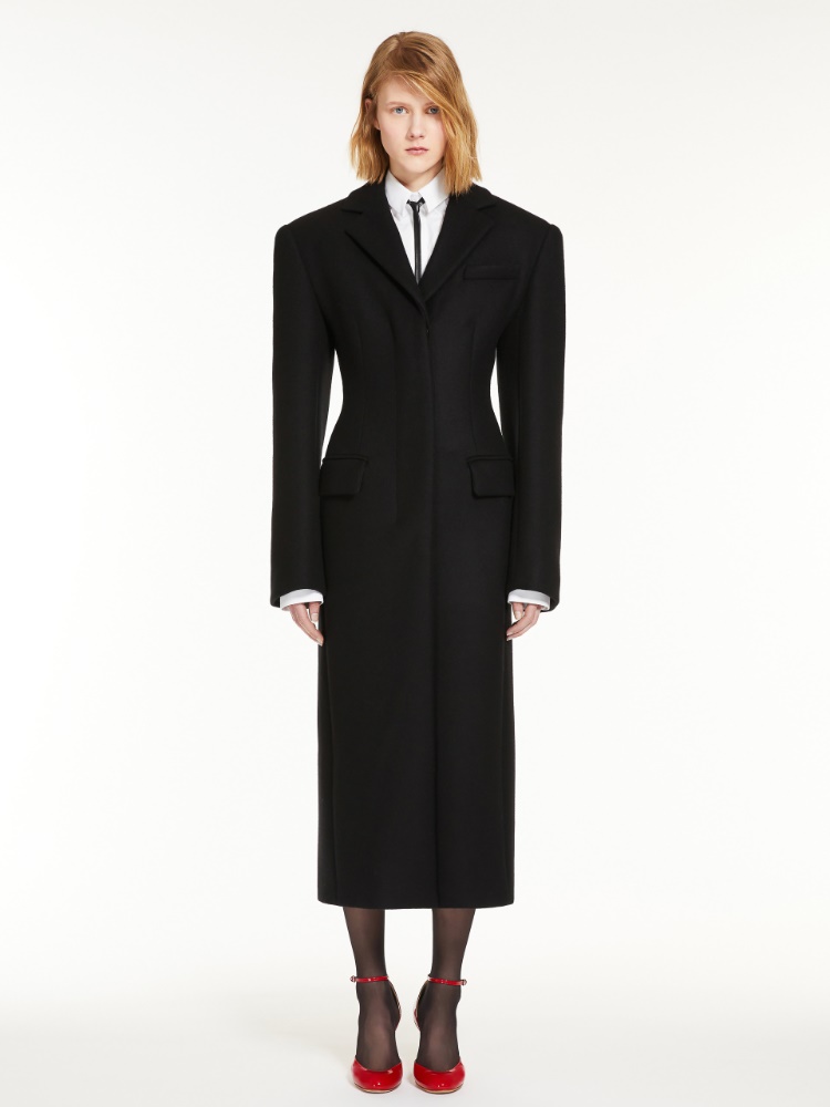 Tailored coat in wool and cashmere double felt, with fitted lines for a feminine silhouette. The darts and contoured side panels accentuate the waistline, while the concealed, slightly high buttoning maintains the clean look of the design. Lined.