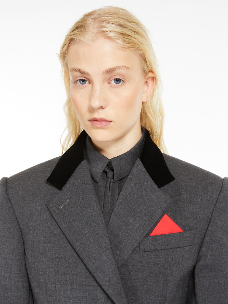 Tailored feminine blazer made of natural-stretch pure-wool canvas. The double-breasted design with concealed buttoning defines the clean look, with deep darts and shaped sides that define the silhouette. The garment is completed by refined details such as the lyons velvet insert on the lapels, the poplin pocket square in the breast pocket and the lining.