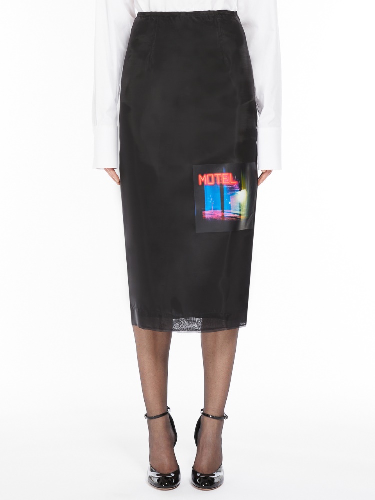 Midi skirt made of technical organza and decorated with a printed appliqué on the front. The simple construction features front and back darts, a wide topstitched hem and a small belt at the waist.