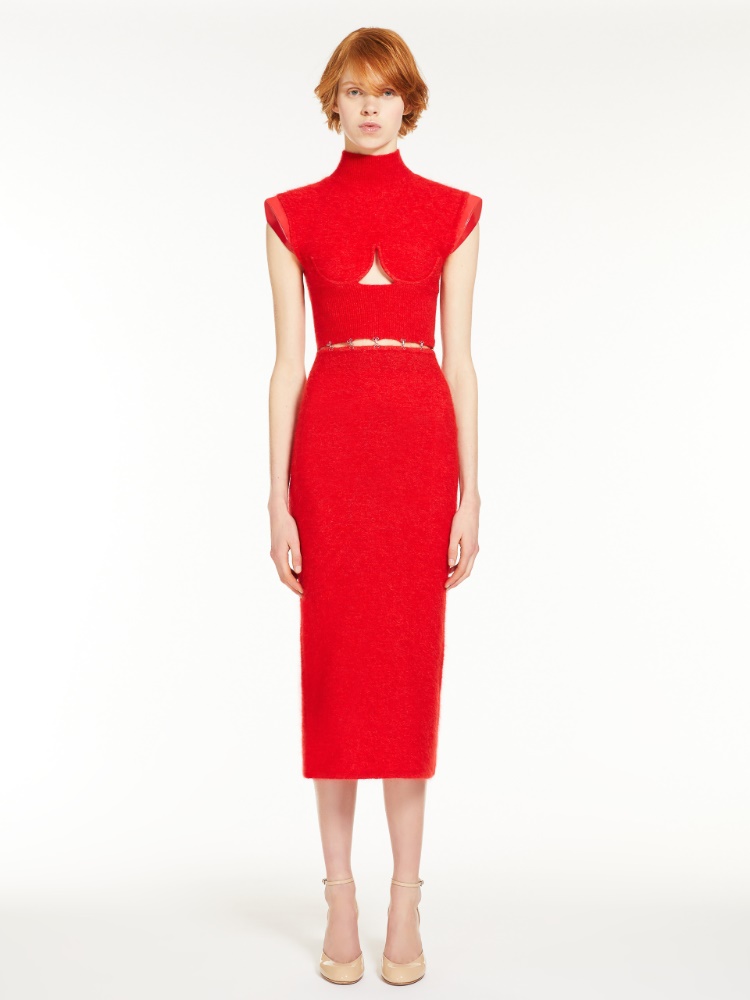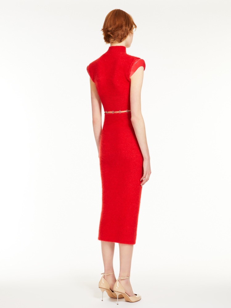 Dress in brushed mohair constructed in two pieces and joined by metallic clips. The top is fitted and feminine with a raised collar, shoulder straps in a patent-leather-effect coated fabric and contoured keyhole opening on the front. Internal underwire defines the bustline. The midi skirt is simple with a sleek fit.