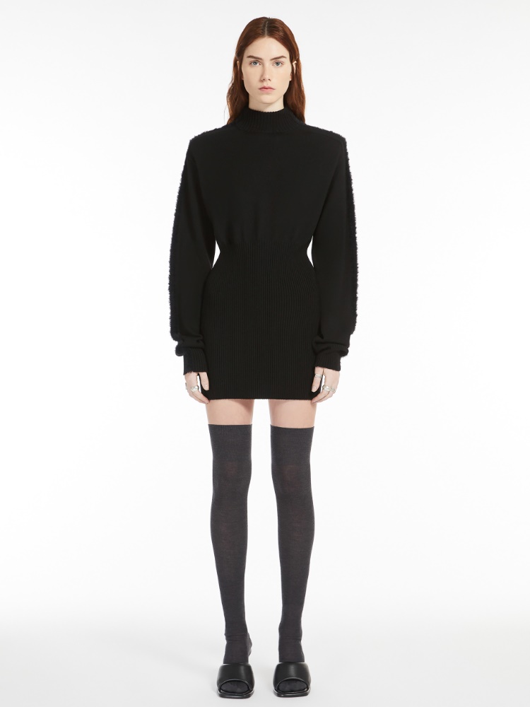 Dress in pure virgin wool knit fabric featuring an on-tone fluffy yarn inlay along the shoulders and sleeves. The model boasts a relaxed-fit bodice with padded shoulders and a raised neck, in addition to a waist and hip-hugging design. Distinctive rib-knit detail on the skirt, cuffs and neck.