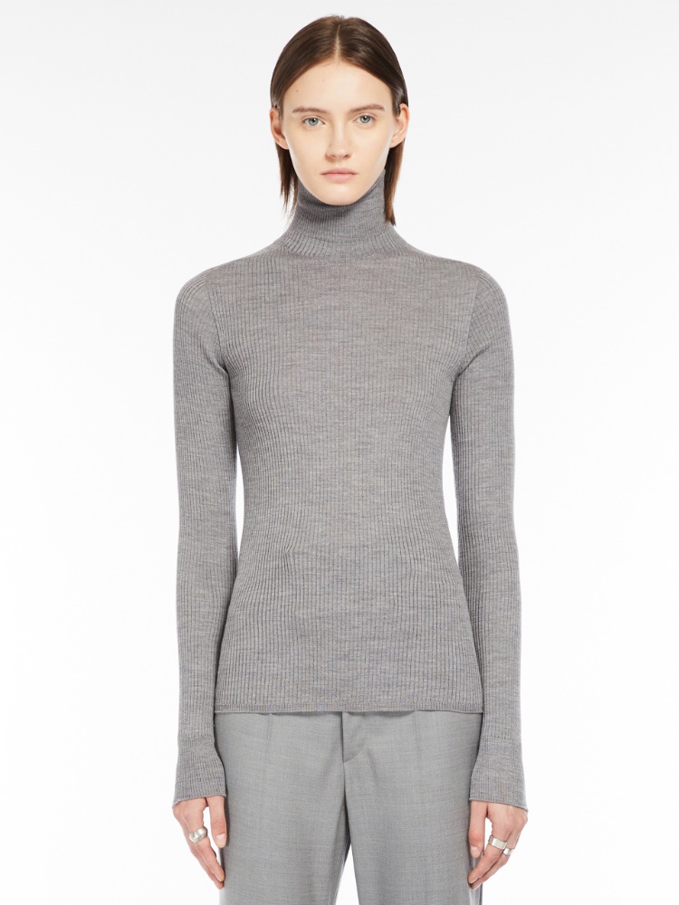 Mock polo-neck sweater in pure virgin wool yarn featuring a rib-knit pattern that results in a naturally snug fit. Hip-length model.