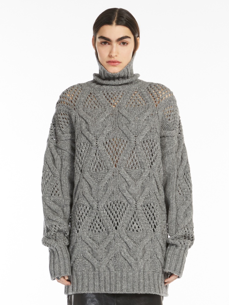 Maxi sweater in fluffy-hand wool-blend yarn featuring a perforated diamond-knit pattern for an open-work effect. The oversized model boasts a rib-knit mock polo-neck, hem and cuffs. Below-hip length.
