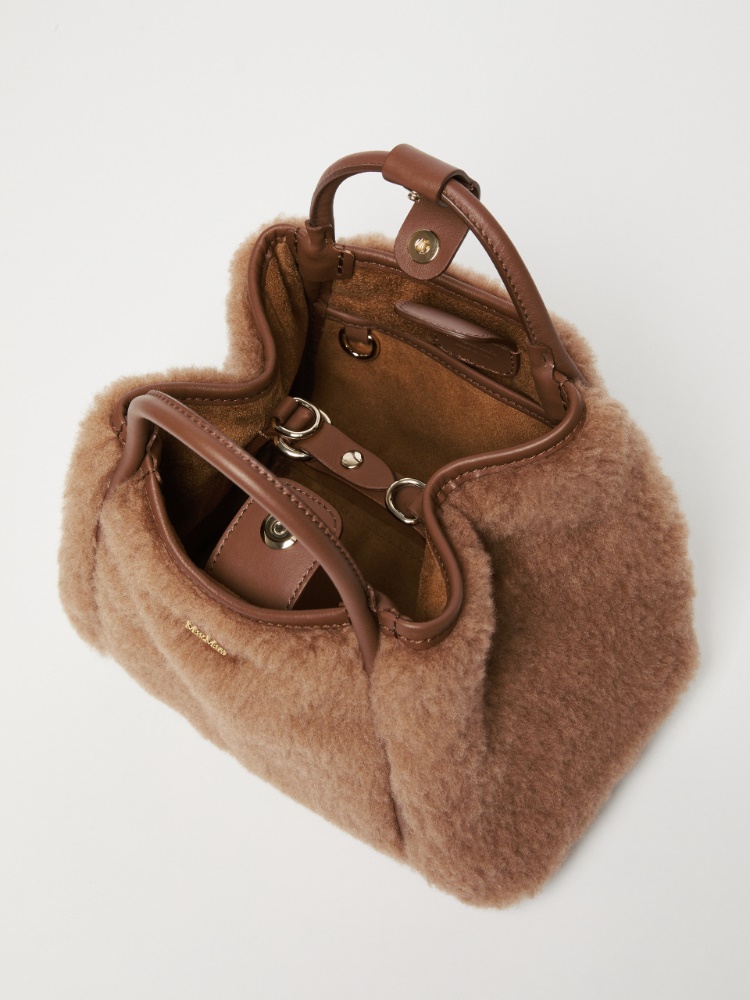 Extra-small version of the Marine bag in camel Teddy fabric on a silk base with smooth leather details. This exclusive creation has a distinctive rounded shape and versatile dimensions thanks to the foldable sides with an internal strap and ring. The iconic tubular leather handles, with a loop to attach them, and the removable shoulder strap allow it to be carried by hand or worn on the shoulder or crossbody. The soft textured interior features two internal open pockets. Finished with Max Mara metallic lettering applied on the front and four metallic feet. Magnetic top fastening. Measurements: 24 x 16 x 15 cm.