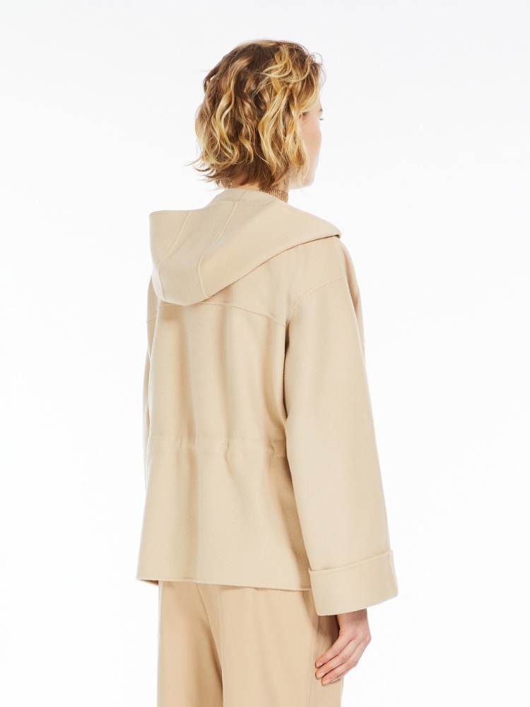 本款短款连帽羊毛外套,宽松版型,长袖落肩设计。腰部有可调节的抽绳,前幅和后幅均有褶裥,前幅饰有军装风格的大贴袋。前襟纽扣开合