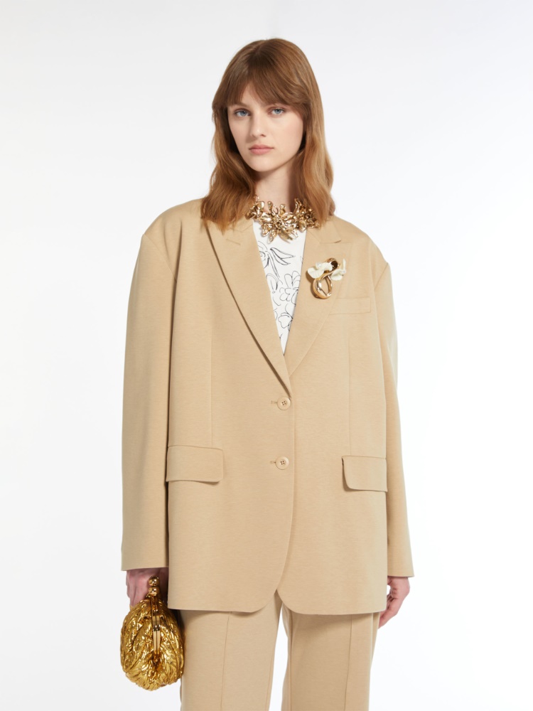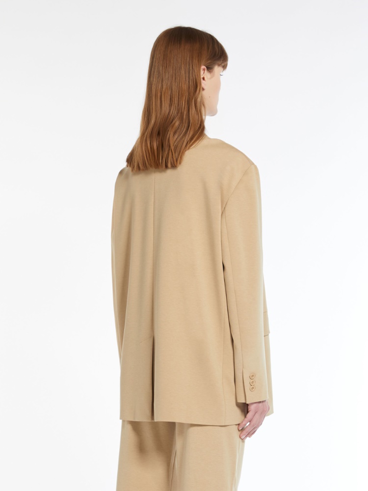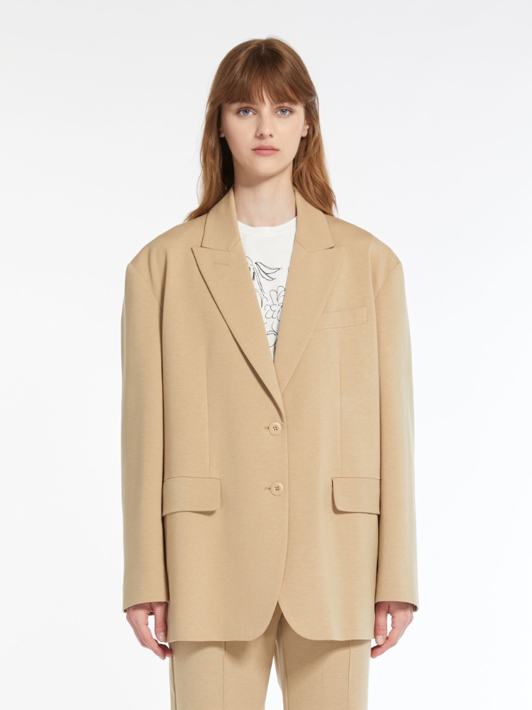 本款男友风西装外套,廓形版型,采用柔软的棉和莱赛尔针织面料。立体剪裁,宽肩部设计。饰有翻领、胸前开袋和前襟缀饰开袋。单排双扣开合。