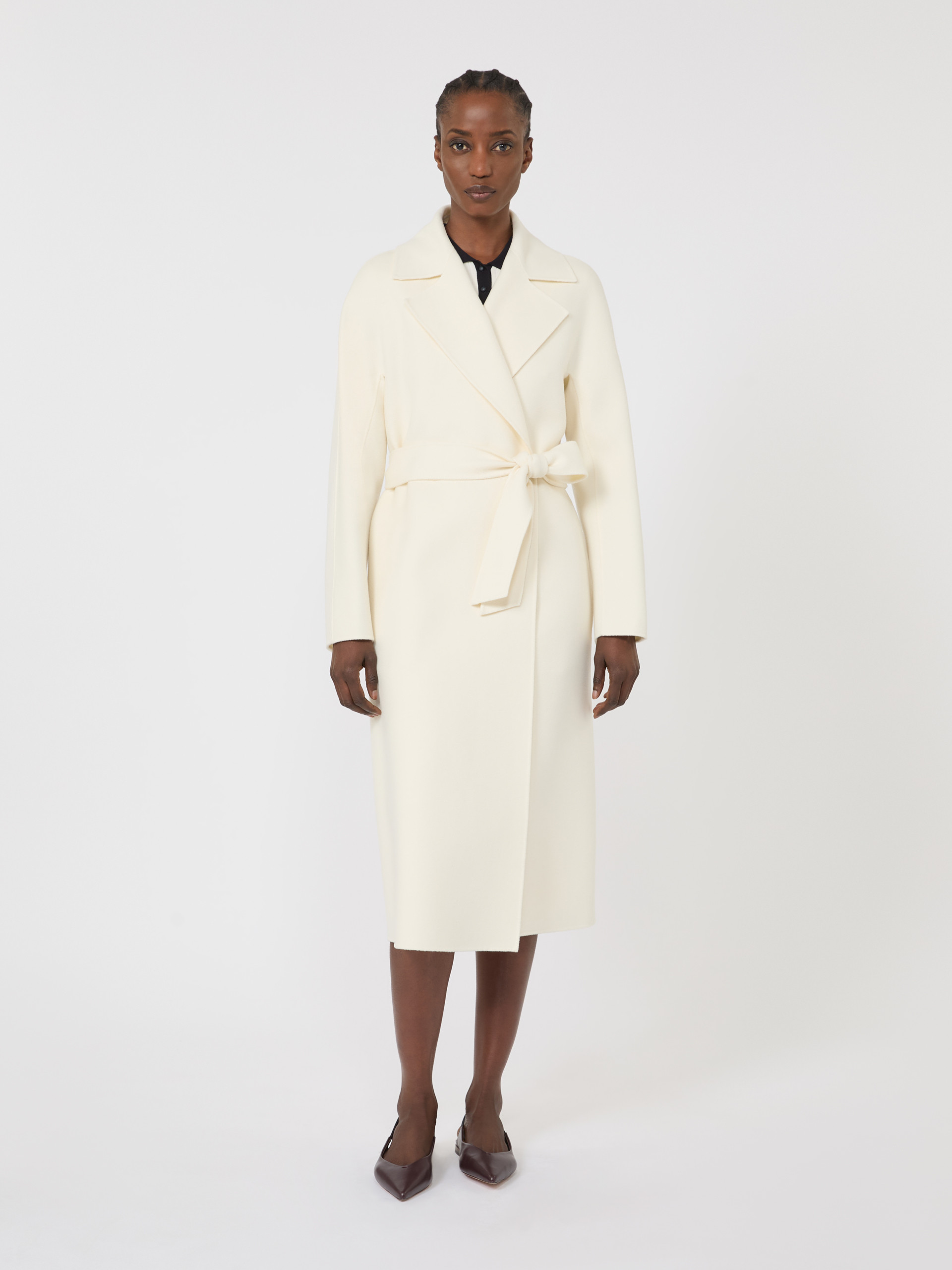 长款裹身大衣外套,配腰带。采用绵羊毛混纺双面呢面料制成,裹身式剪裁,翻领设计,长款和服式衣袖,侧缝插袋,无内衬。