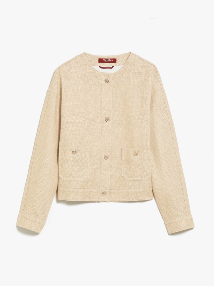 本款夹克,采用优雅的亚麻布混纺面料,圆领、长袖设计,前幅贴袋饰有上有纽扣。前襟纽扣开