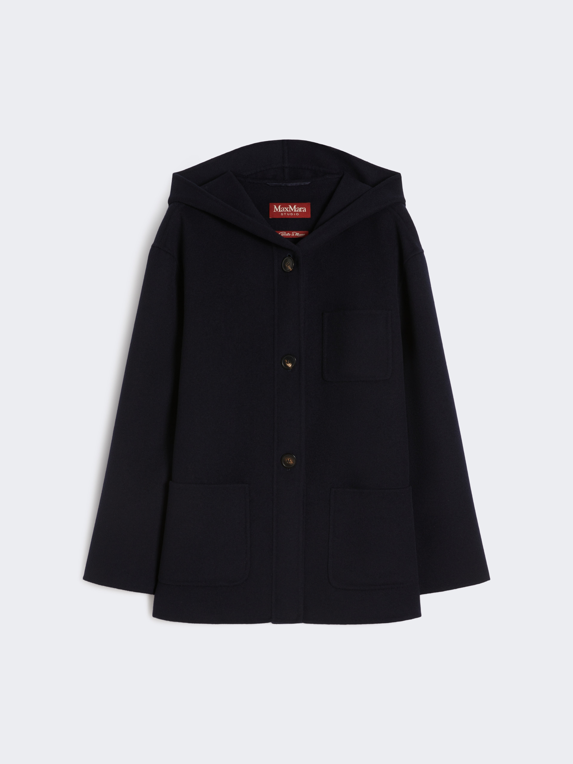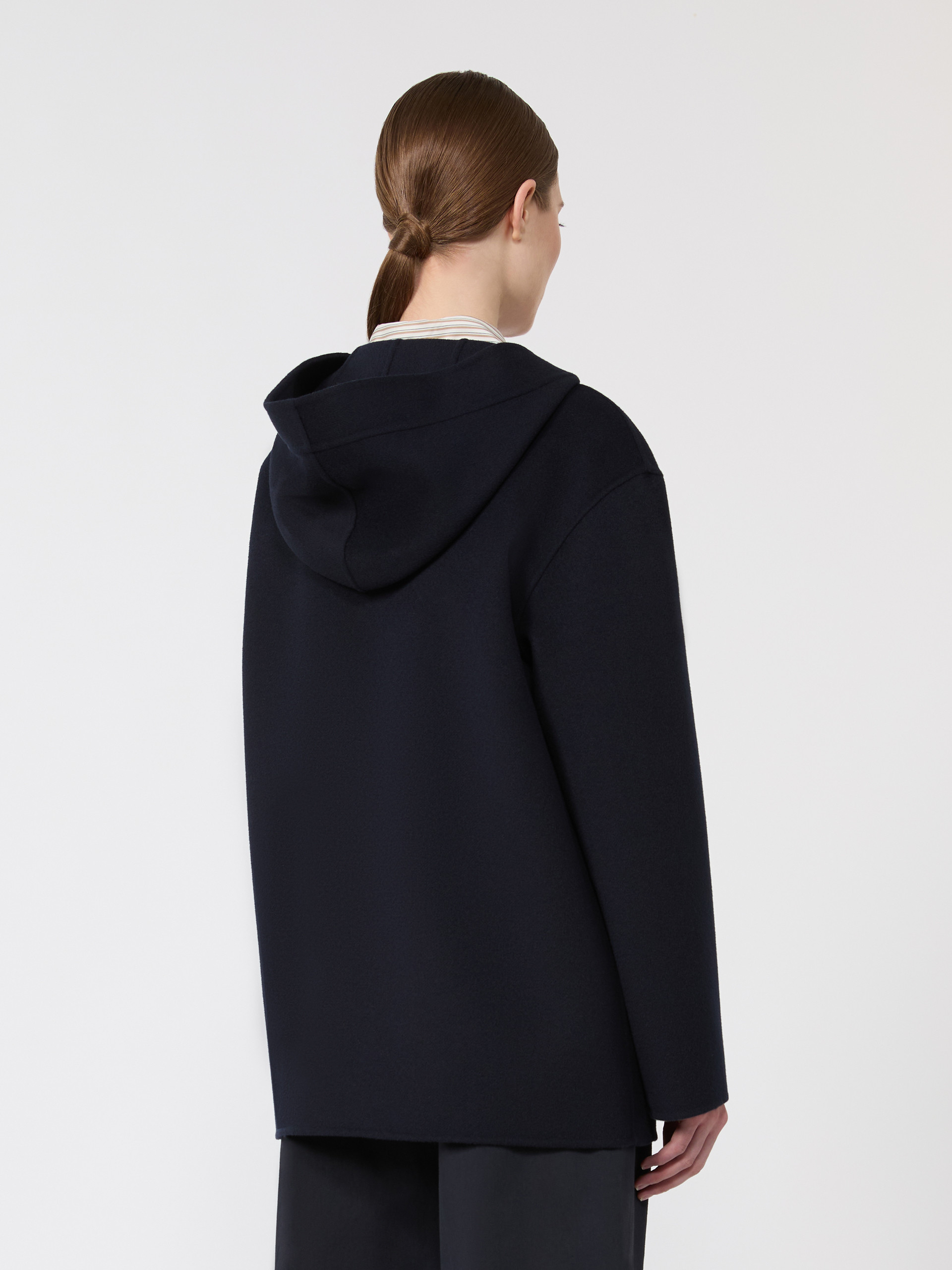 短款单排扣大衣外套,配有大帽衫。采用双面绵羊毛混纺面料制成,手工缝制,前襟纽扣开合,胸袋与低位贴袋设计,无衬里款式。