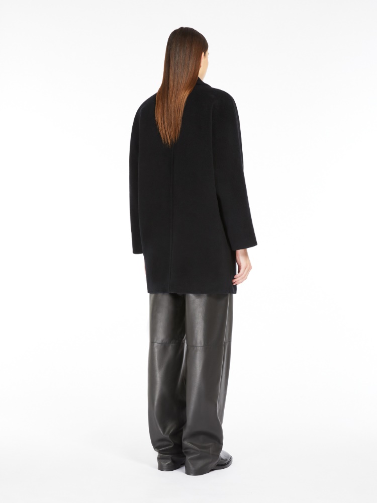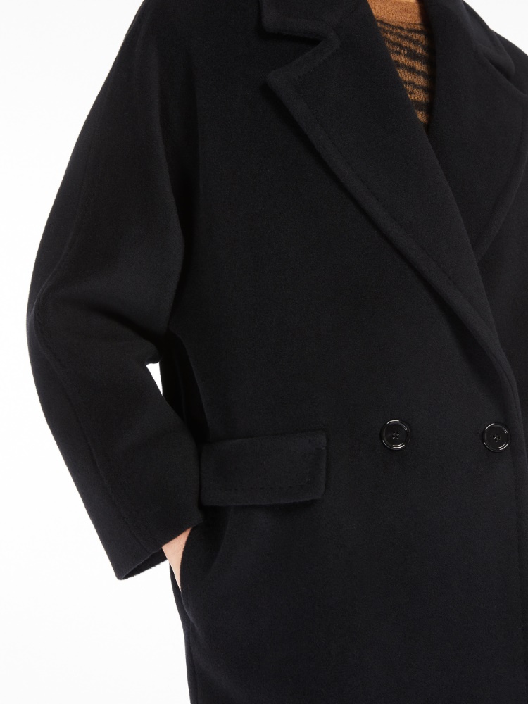 Double-breasted jacket with an oversized volume made of exquisite pure wool beaver. The garment features a lapel collar, wide kimono sleeves and inset side pockets with a flap applied on the front. Garment lined in jacquard fabric and featuring a low fastening with two visible buttons.