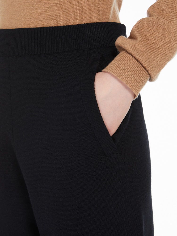 Wide-leg jogger-style trousers in linen-knit viscose and wool yarn. The comfort-fit model boasts an elasticated waistband and ribbed ankle cuffs.