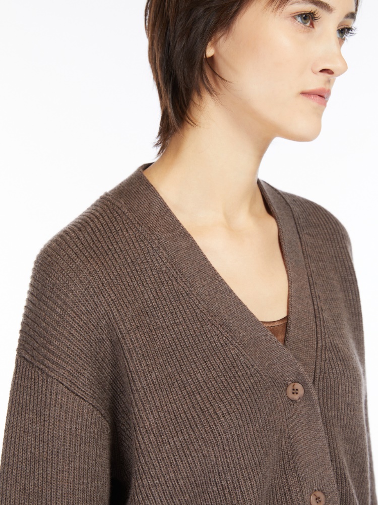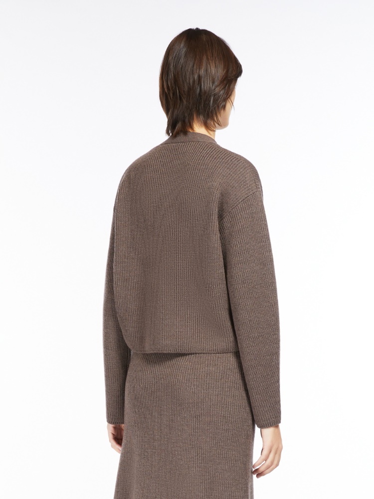 Cropped cardigan in luxurious pure-wool yarn. The style is defined by a V-neck and long low-set sleeves with a particular balloon shape. The English ribbed knit and ribbed edges finish the garment. 3-button front fastening.