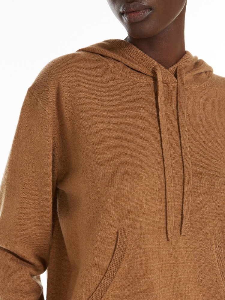 Short sweatshirt with drawstring hood, made of a soft, luxurious wool and cashmere yarn. The style features long low-set sleeves and pouch pocket on the front. Finished with ribbed cuffs and edges.
