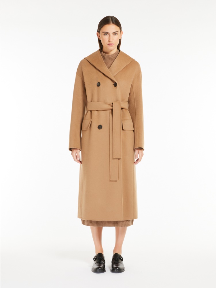 Long double-breasted coat made from hand-sewn, luxurious pure wool drap double cloth. The style features a wide and enveloping collar with hood, long sleeves with dropped shoulders and cuff buttons, and patch pockets with flaps on the front. The matching belt allows you to accentuate the feminine silhouette. Semi-lined style finished with a central vent at the back and an exposed button closure.