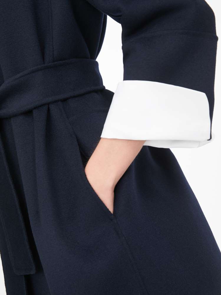 本款手工缝双面法式拉绒羊毛大衣,小翻领设计,有侧缝口袋,正面采用和服袖设计,后背为连肩袖结构,微阔版型,无衬里。配有相称腰带。