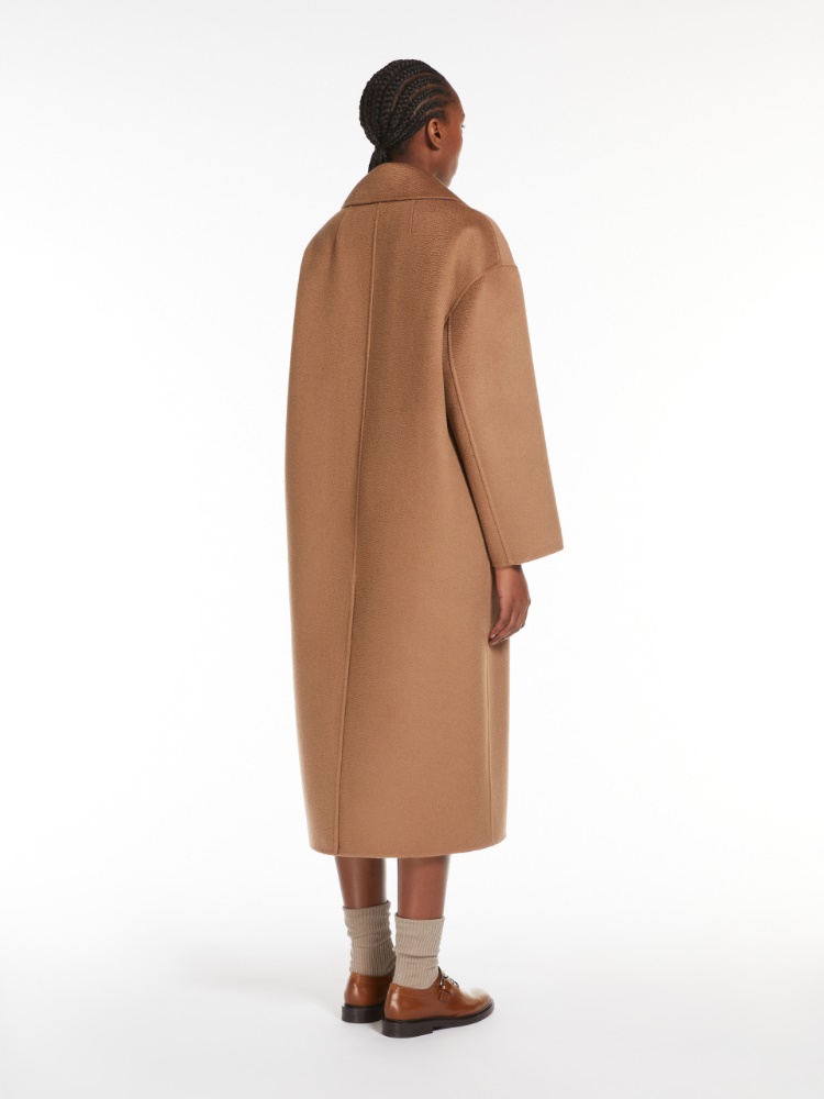 Long, straight, double-breasted coat made from hand-stitched luxurious wool and cashmere zibeline double cloth. The style features a lapel collar, welt pockets on the sides and long sleeves with dropped shoulder. The matching belt accentuates the silhouette. Finished with centre-back slit and visible two-button fastening on the front.