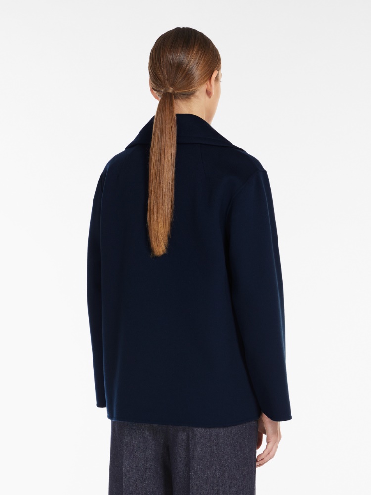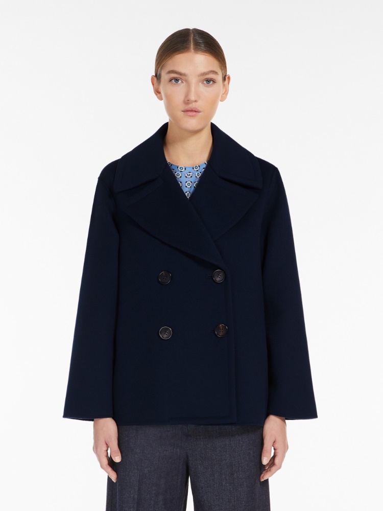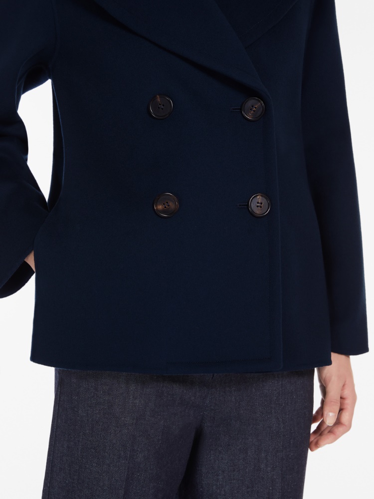 Double-breasted pea coat in fine hand-sewn double-faced pure wool fabric in a silhouette that is slightly flared at the hem. Classic wide lapel collar, and side seam pockets. Visible button fastening.