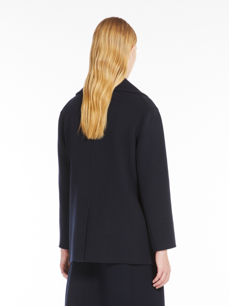 Double-breasted pea coat made from hand-sewn, luxurious pure wool drap double cloth. The style features a slightly flared line, lapel collar and inset side pockets with a flap on the front. Semi-lined style, finished with a central vent at the back and an exposed front button closure.