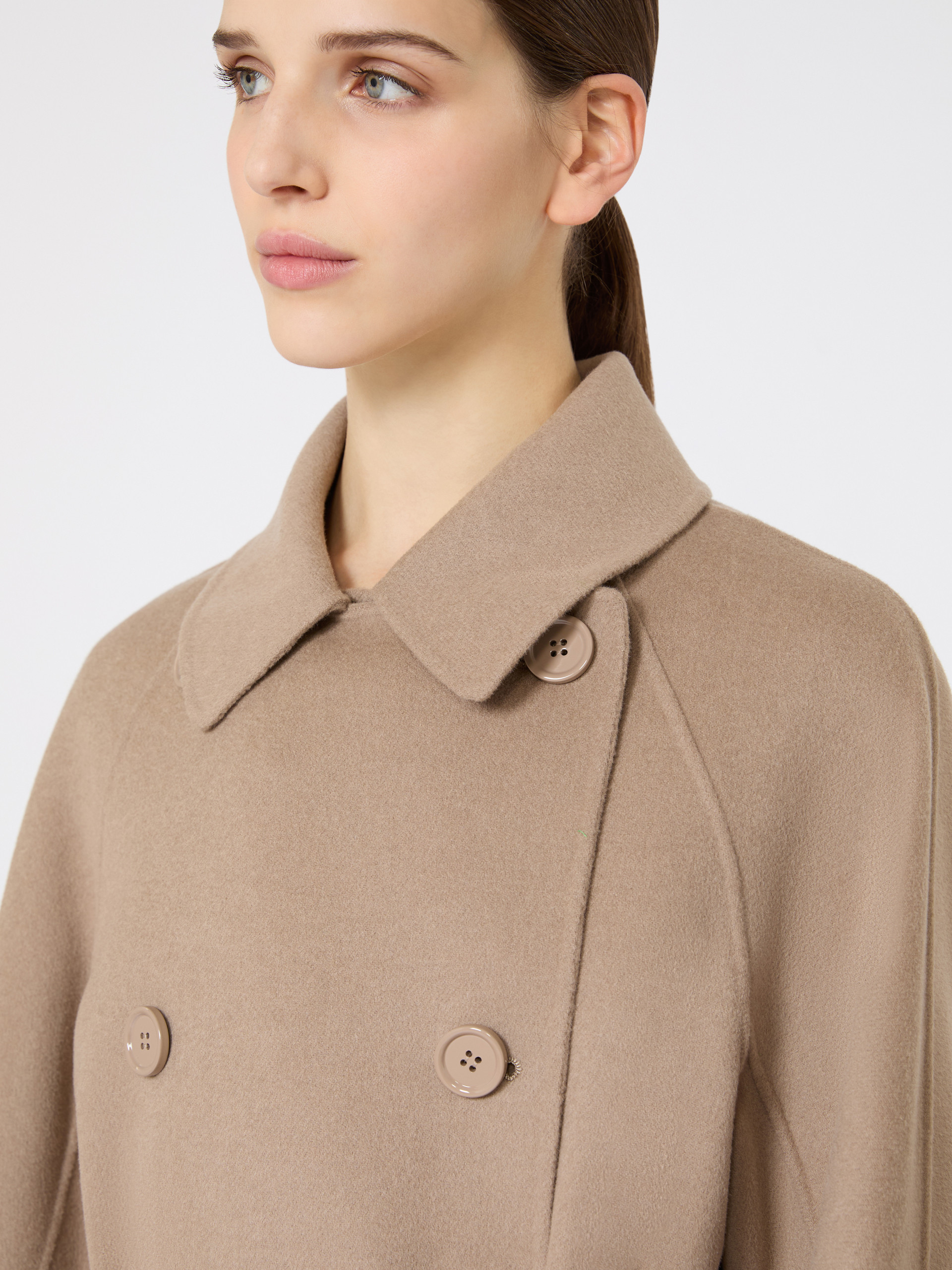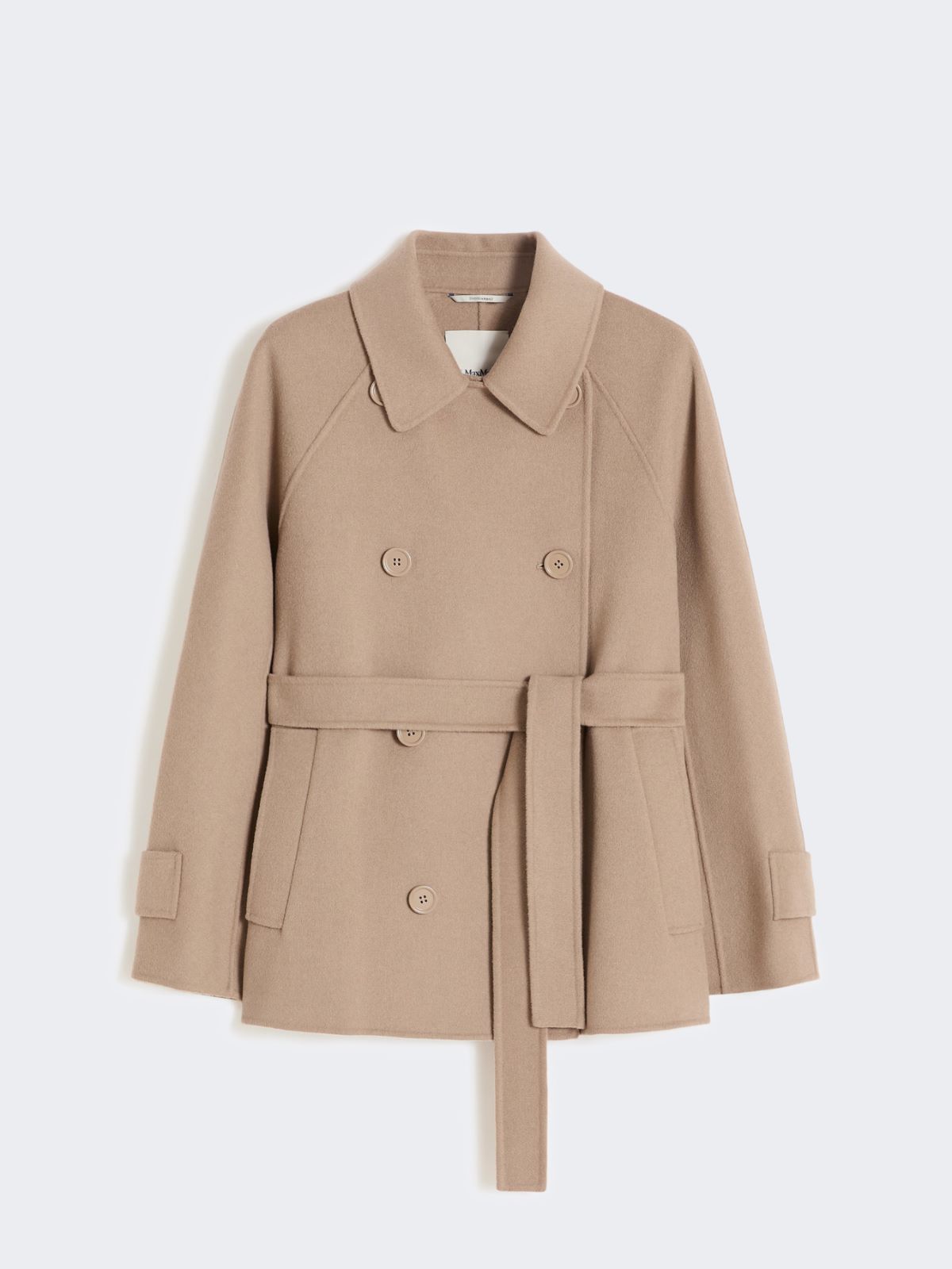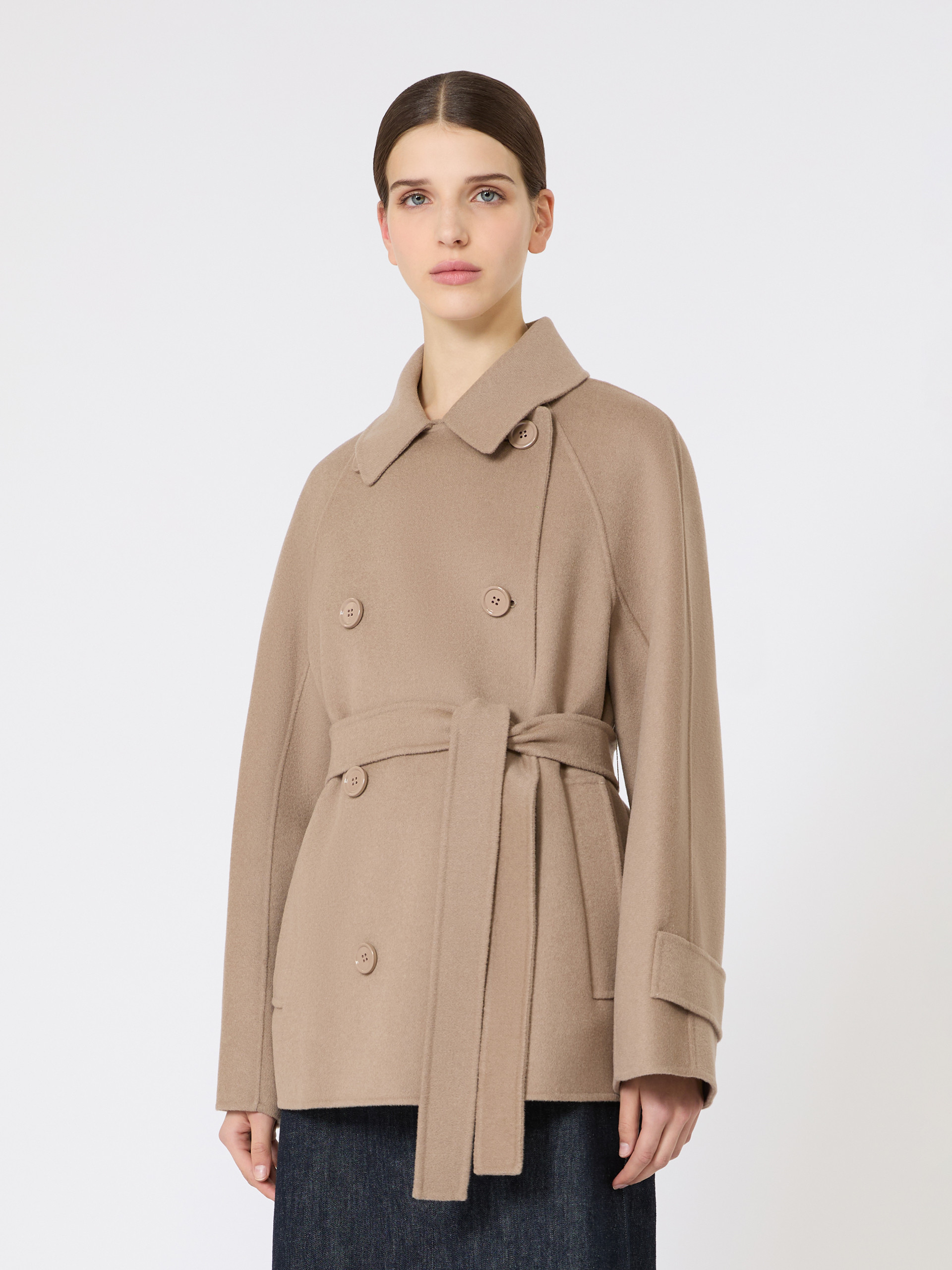 Short double-breasted coat featuring iconic trench coat-style details and a matching belt at the waist. - Double drap pure wool coat - Boxy fit with a central rear slit - Dual use shirt collar - Raglan sleeves with cuff tab and button detail at the hem - Visible button fastening on the front - Welt side pockets - Unlined model