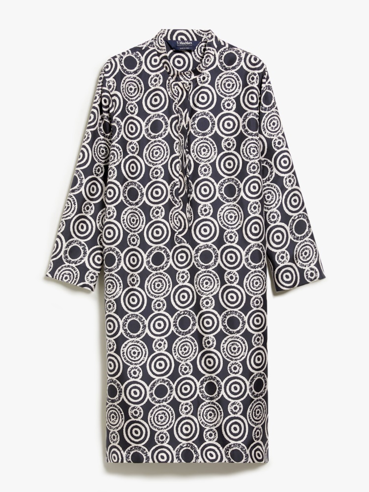 本款长衫式连衣裙,采用优雅的印花真丝斜纹布面料,采用圆领设计、后部倒褶设计,饰有缝内侧袋,版型宽松。前襟暗扣开合。